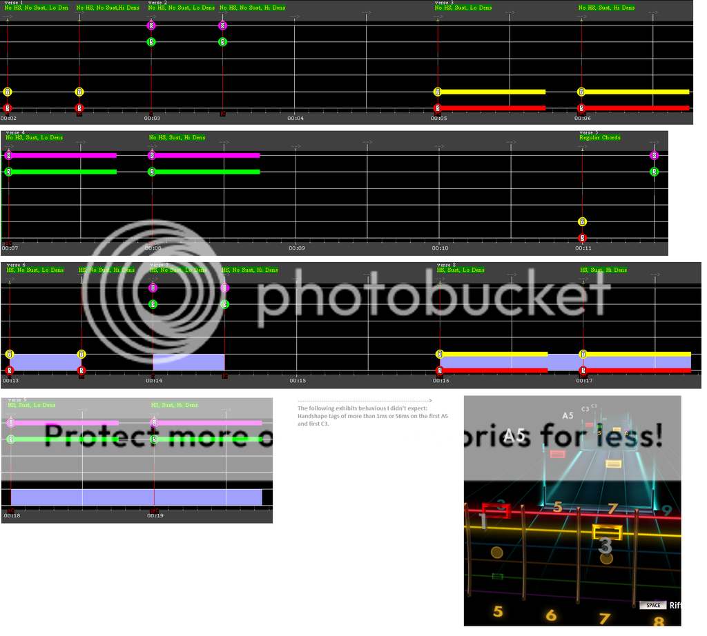 As noted in my dummy chords summary post this week and in the conclusion of Test 7a, one of the necessary evils of dummy chords with sustained notes superimposed upon them set to ignore="1" is that missing the dummy chord will correctly see the chord not score (blink) in-game, but given the single notes are set to ignore ="1", the fret(s) surrounding single note(s) will blink no matter if the correct notes were hit or not, perhaps fooling the player into thinking they got something right. But I think that a chord box not blinking is quite obviously a miss despite a few frets blinking so I think we can accept this "necessary evil" of sustained single notes (set to ignore ="1") superimposed upon dummy chords".