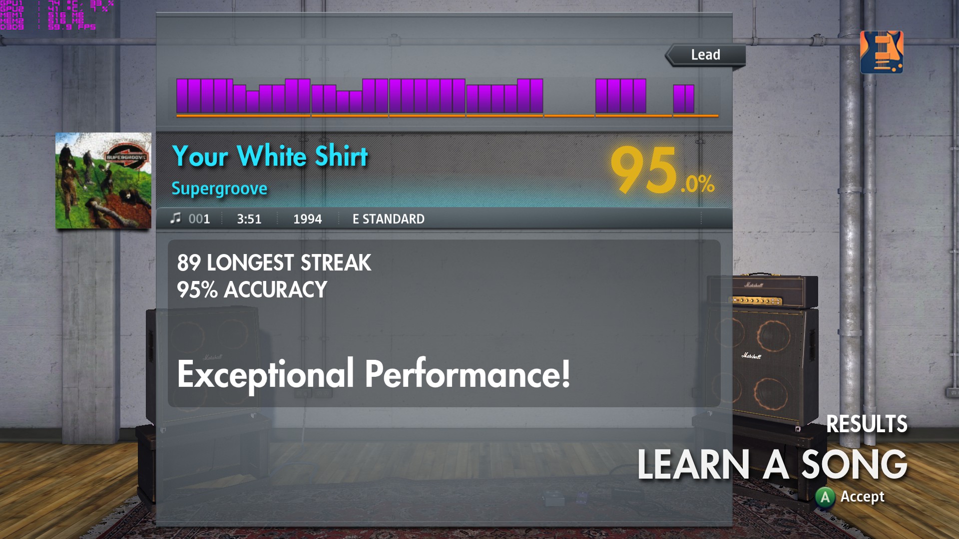 Well, I did a try at "Your White Shirt" trying to play the notes where transcribed... I made it a whole 4 phrases into the song on score attack. After that I tried it on learn a song, and somehow managed not to get any of the phrases downgraded.