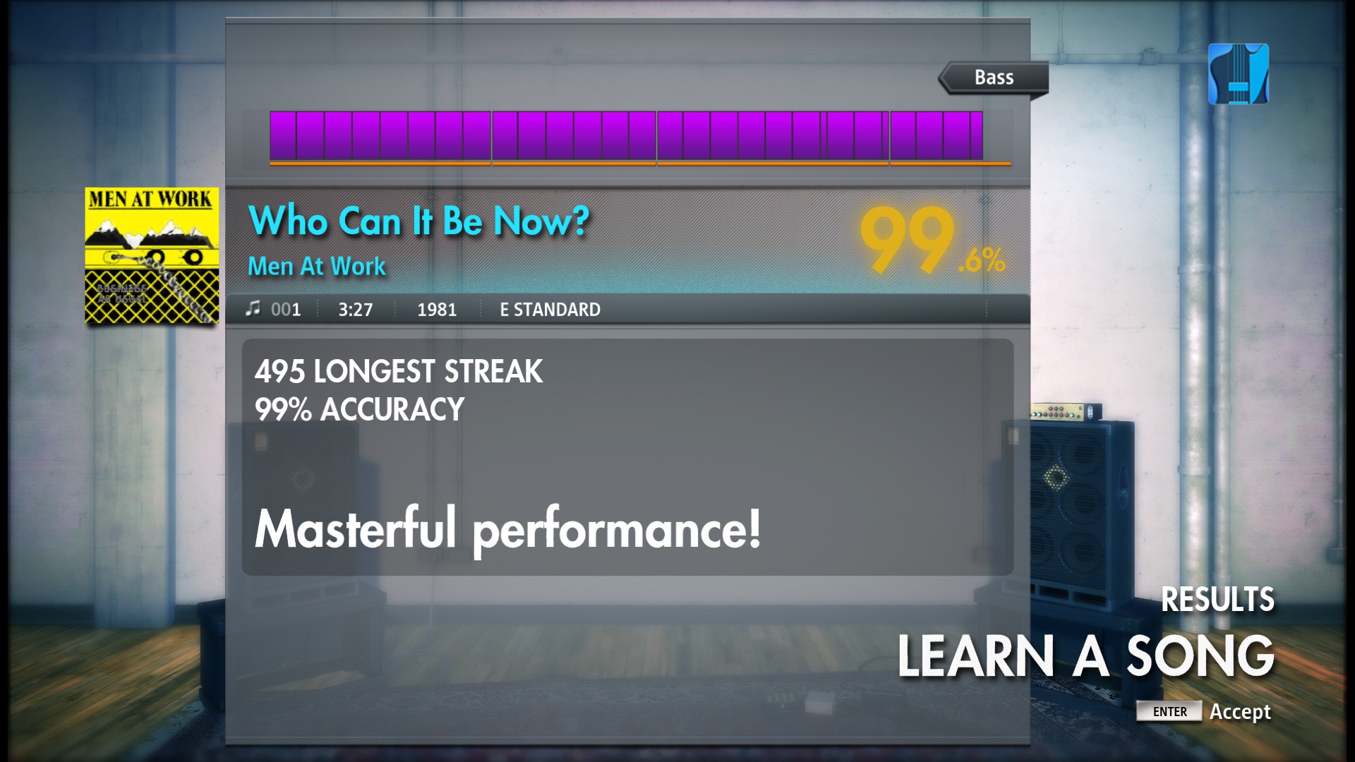 Both beginner bass songs this week are just too easy to the point of being boring.  I did one pass through of each, without RR and both scores were 99% plus.  I'd never even heard the song Where The Sky Ends before and still scored 100%.  For Who Can It Be Now, I had to settle for 99.2%.