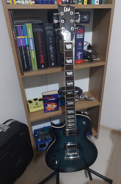First One: Jackson Kelly JK20 in metallic blue, Student Model, Made in India. added coil splitter, duncan pickups. Same wiring configuration and pickups as Petrucci used in his Ibanez models. My first real guitar.