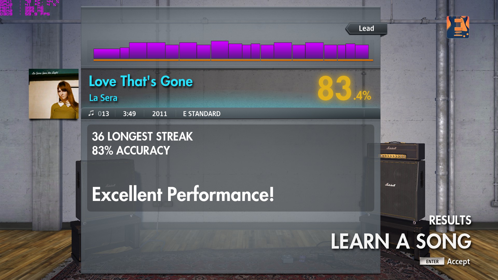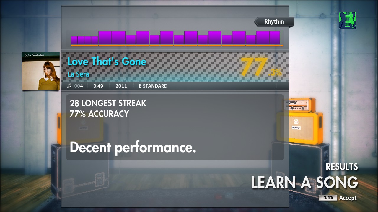 Lead is the same as rhythm except the little single note riff in the postchorus/outro is up an octave, which I found makes it a bit more awkward to get to from the preceding powerchord. So obviously I can improve on the rhythm stuff. On lead I still had a few stupid mistakes in the intro/pre-verse riff later in the song, so between improving on that and practicing the outro riff (and probably practicing the chorus a bit more) I should be able to pick up another percent or two.
