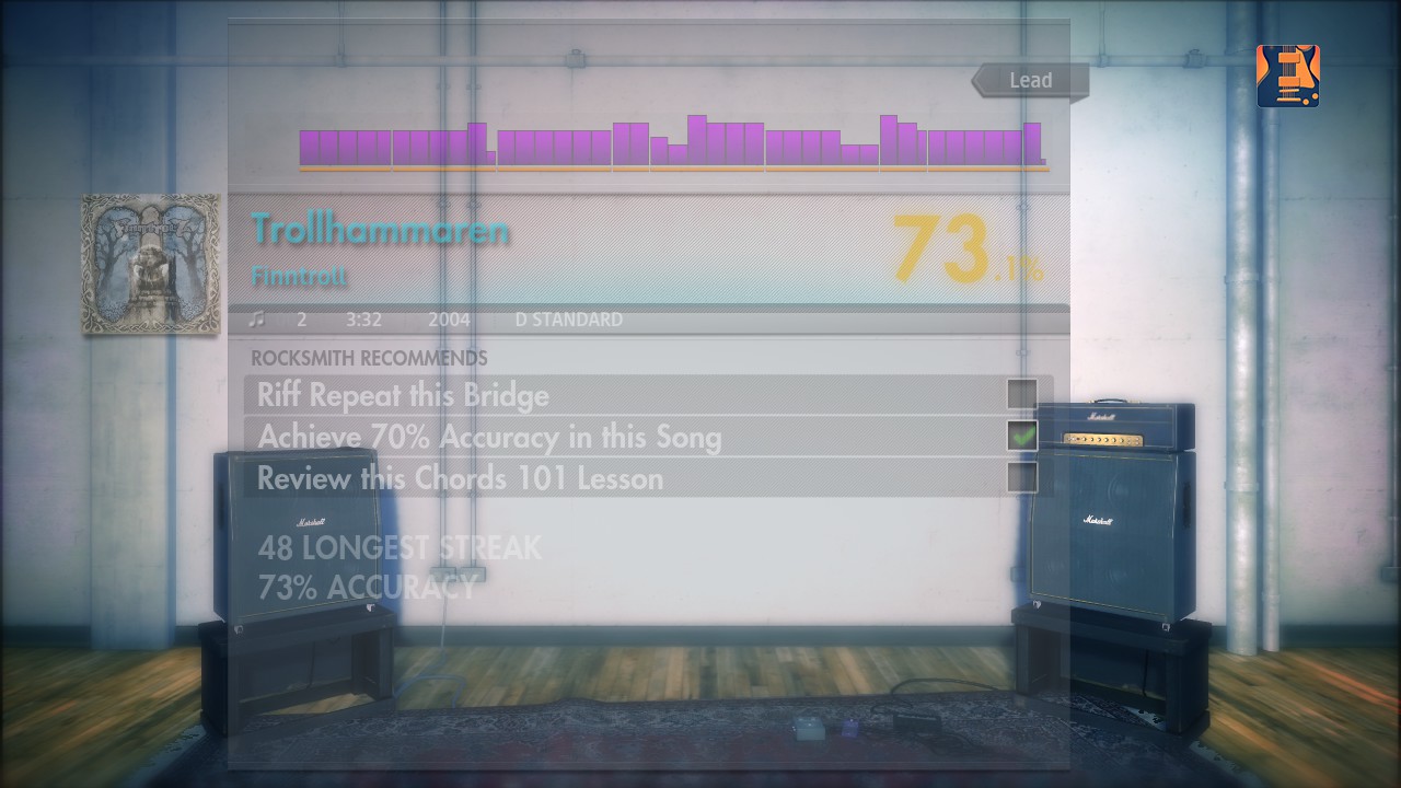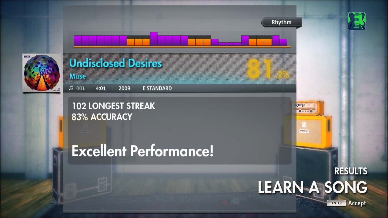 http://i.imgur.com/ijg0E9o.jpgReally solid on almost everything except the postchorus riff. Practiced it a bit more with the rest of the chorus riff (which I'm now damn near ironclad on), but not nearly enough to have mastered it. Between the string switching and position shifts I almost always lose my place.