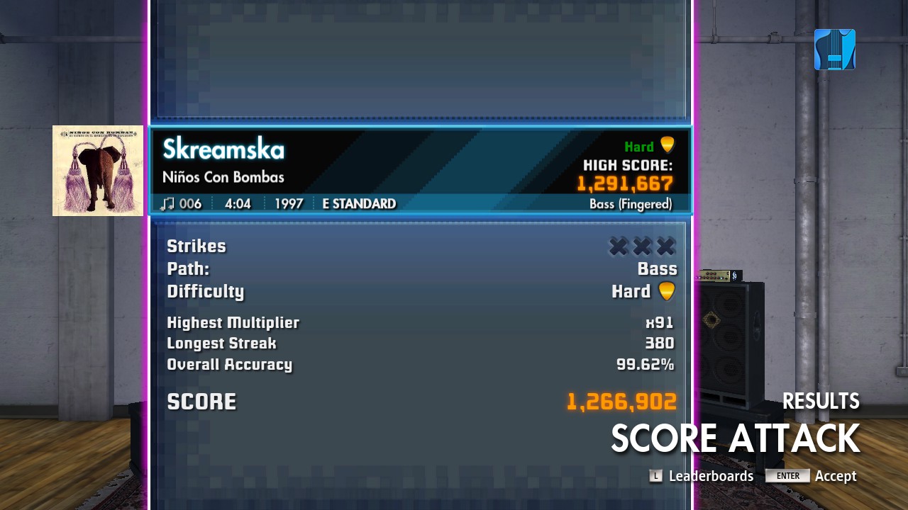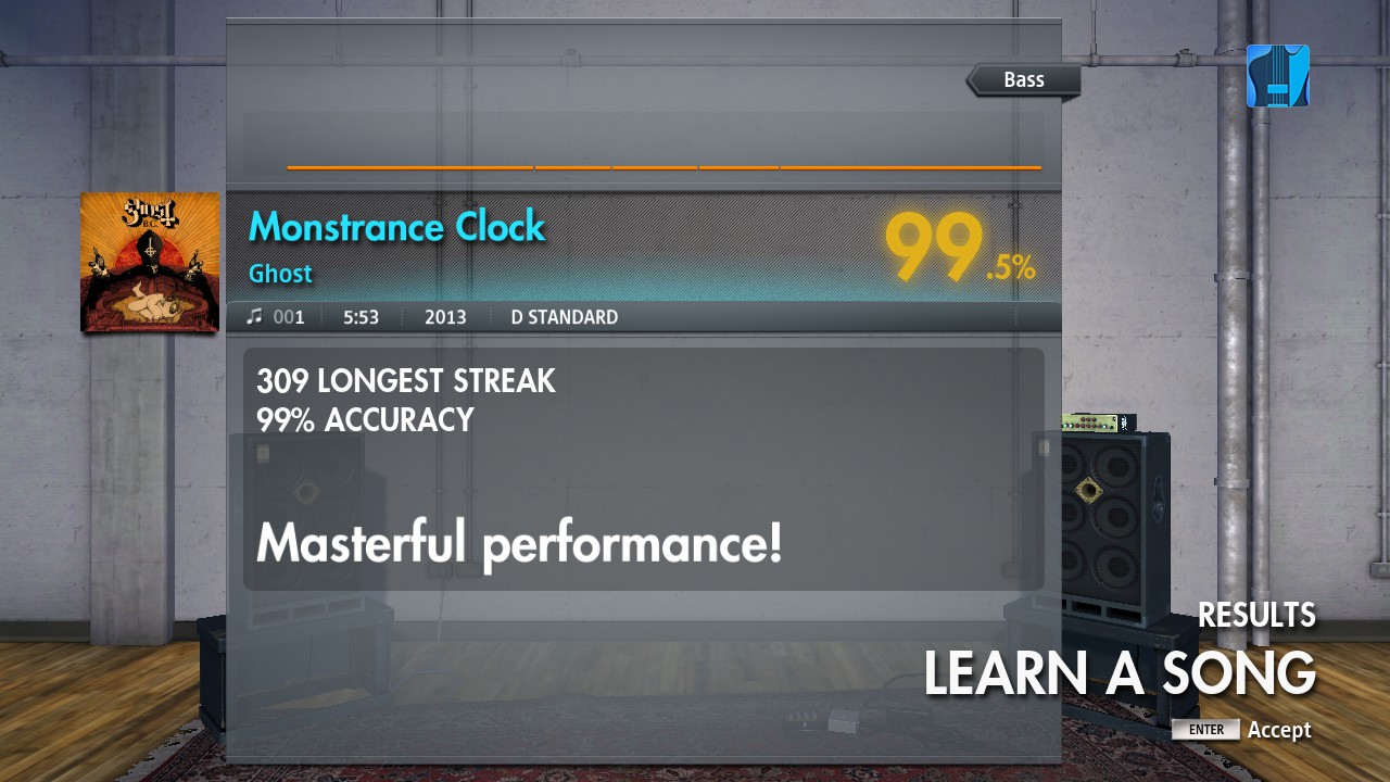 Sorry, but this MC song does not feel like a 9 in difficulty at all, more like 6 . If it wasn't for the missing slides I would probably get a 100%. In addition, the song is sooo long (and boring), with big chunks that does not involve a guitar or bass.  Is it possible to change song, organizers?