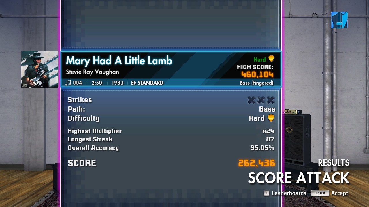 I destroyed the solo here and I got robbed by recognition. My strikes here are both in the chorus because unless I play certain notes SUPER far in advance, it doesn't fucking score them. Oddly in Learn A Song this isn't an issue but every goddamn time I play SA it is.  Can't even pass chorus phrases unless I intentionally make the chorus riff sound terrible. Maybe I need to fix my action.