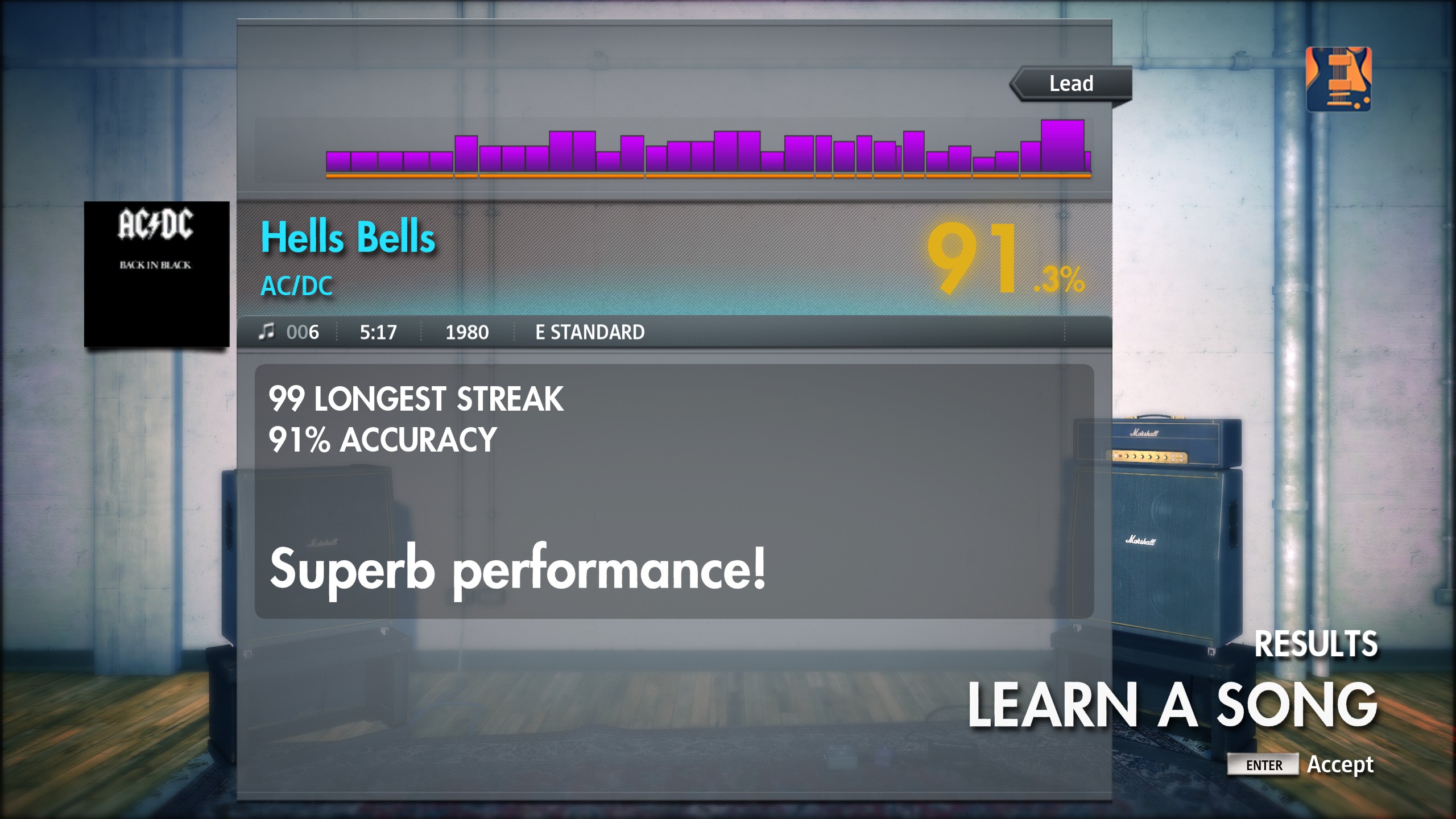 Lead scores depend on hitting the purple and green strings at the right time on the right frets and the double orange + green string bends, as the 'Da Da DaDa Da Da' bit is now second nature after playing it so many bloody times.