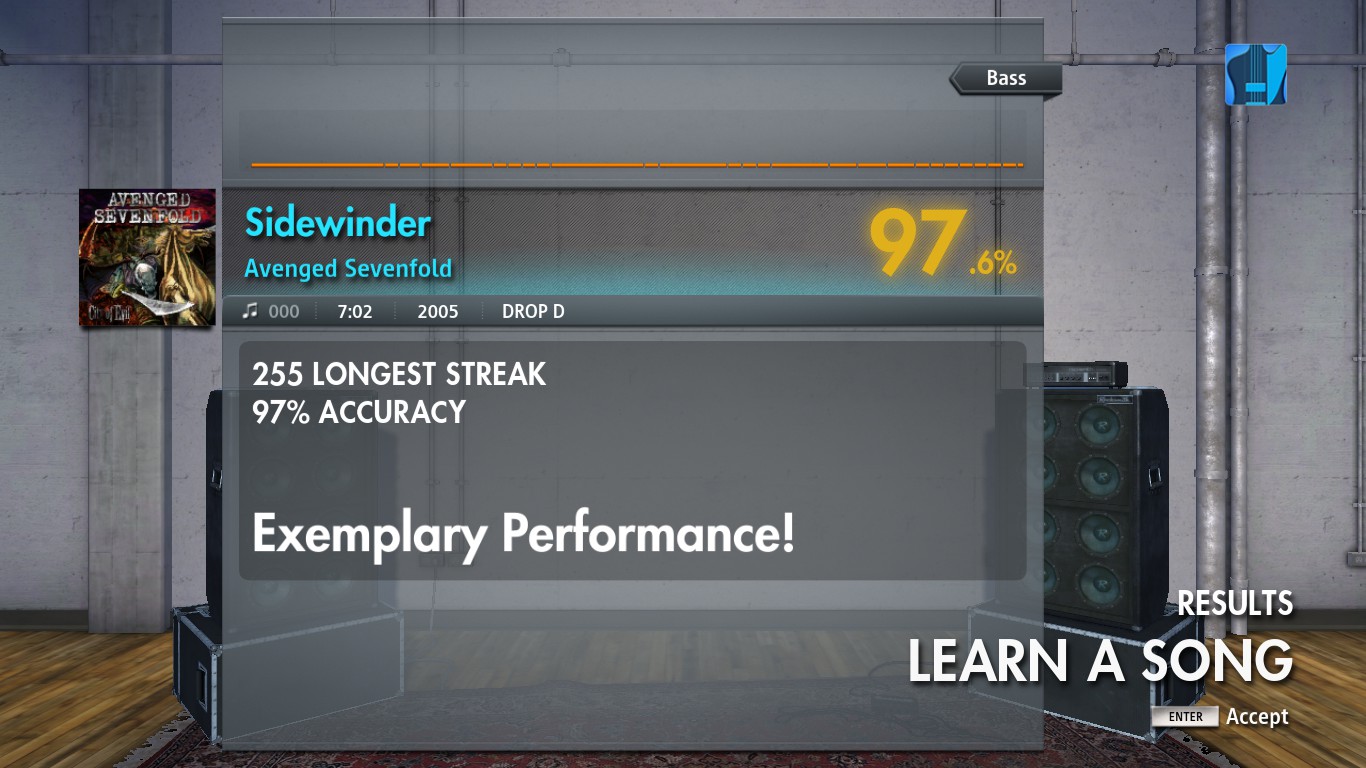 As for Sidewinder, this went decently well, but i just couldnt hit some of those juicy notes, and rocksmith (for me at least) doesnt pick up slides well, so i have a feeling i lost at least .3% to that. Either way, good song, good band, good memories.
