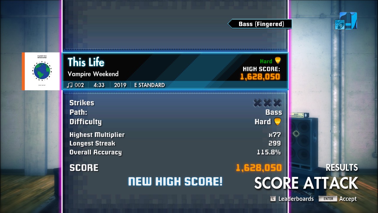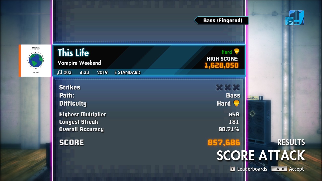 So I had the craziest Score Attack run...had my best start on This Life, was up to a 50+ multiplier with only like 1 missed note halfway through the song. Then suddenly the backing track completely dropped out but the bass tone and note track were still working. I continued to play and played through a whole section before the backing track suddenly came back and I was thrown back to the place where it had dropped out. I played the same section again and finished the song with what I thought was 99+% accuracy. Then I saw this: