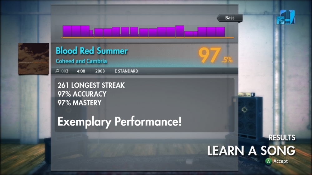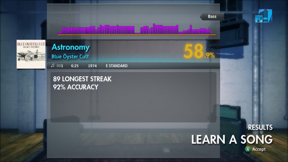 I actually took two attempts on Astronomy and Fade to Black because my E String was slightly sharp and caused me to miss a lot of notes -- especially during the triplets in Fade to Black. The bridge section on Mr. Blue Sky -- played twice -- was a step up in difficulty, compared to the rest of the song.