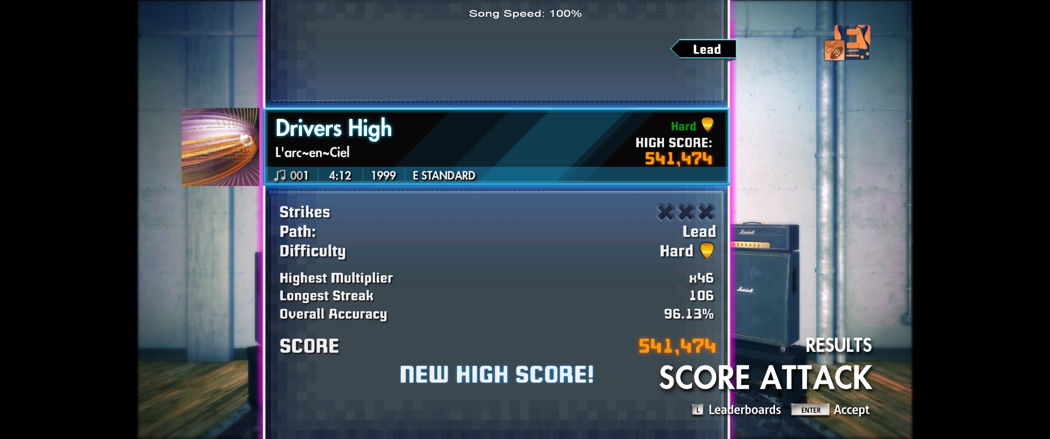 Beginner Lead = same % but higher score/streak - feel like I'm close to 100%, just can't nail the solo at the end out of Riff repeater
