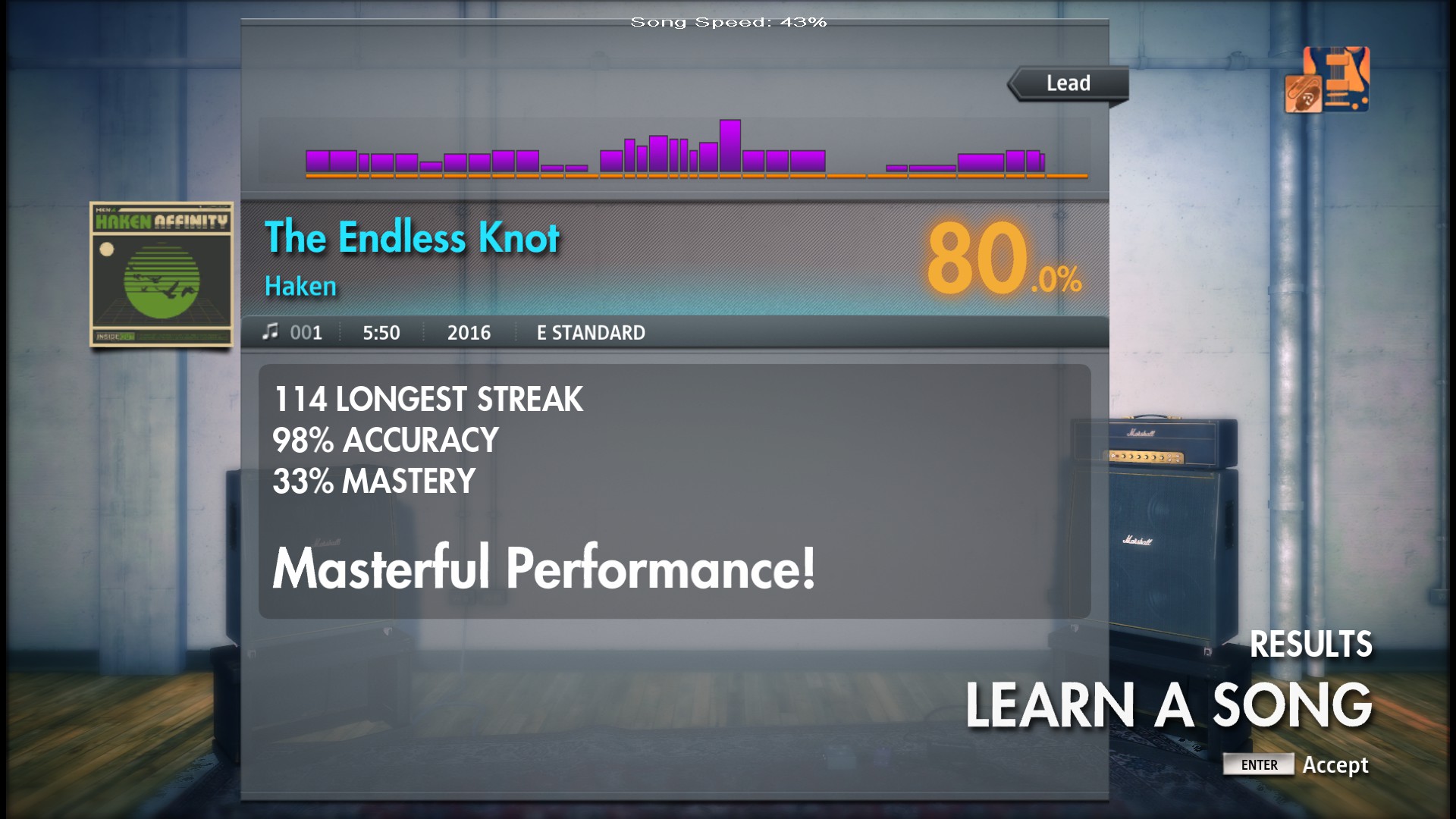 You need to explain this screenshot. 🙂 I don't know how you achieved 98% accuracy here with 33% mastery. You were playing at 100% difficulty, so either you weren't playing at full speed or you were rewinding the song. Anyway, the OCR read 98% here, so you automatically won the week. 😄