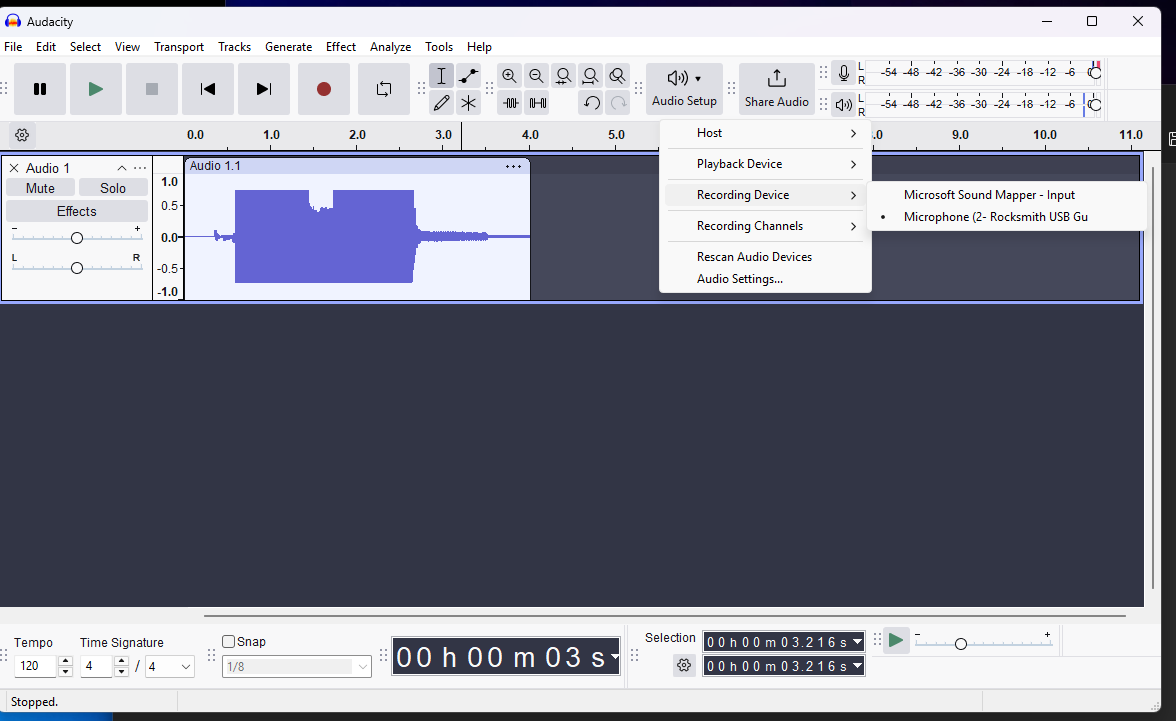 When I try to use Audacity (it detects the Rocksmith USB guitar as a microphone) to record and Rocksmith is running I get error (only if Rocksmith is running): -9985 Device unavailable