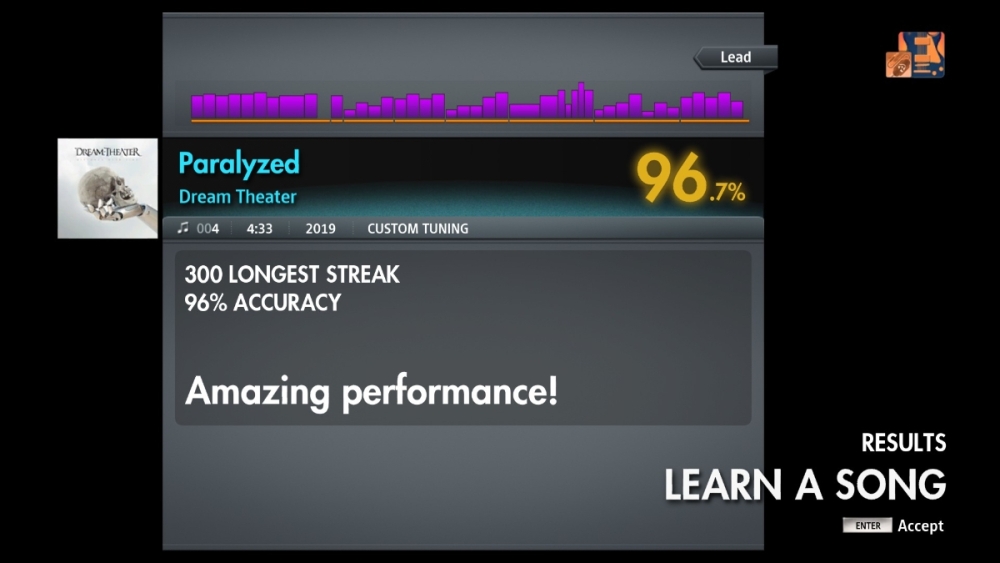 Really tough solo, way too complex for me to sightread first try haha. I'd have to learn the solo if I wanted to get a higher score on this one, but 95.6% is fine for me. I prefer playing the low tuning one so that I can use my own tones while playing.