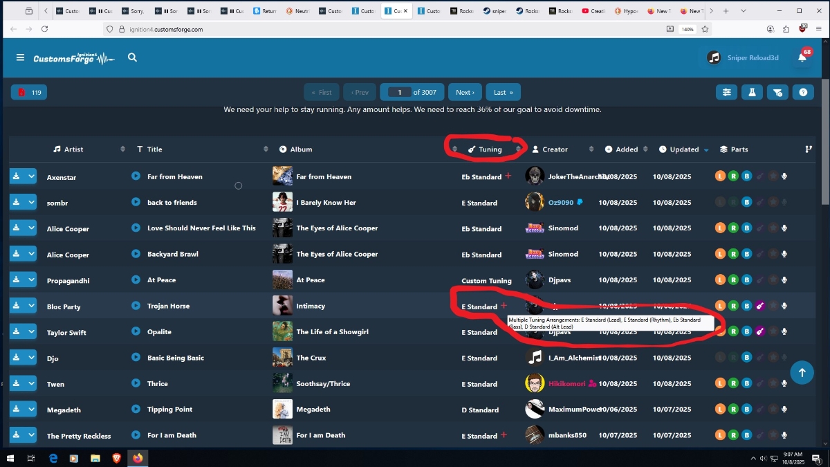 and politely as possible ask Unleashed2K to add that feature (as it is on the main search page) in that thread, linking your above post  (https://customsforge.com/index.php?/topic/80586-tunings-on-song-lists/#findComment-408873) so that he knows and sees what page that you are talking about. Keep in mind that he is really, really busy working on Ignition at the moment, as well as other things. Just because you ask for it, doesn't mean he will, and if he does, it may take some time, again as he is busy. But it seems like a fair request to me, he may add it.