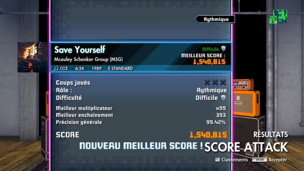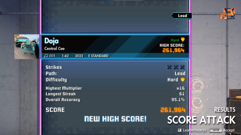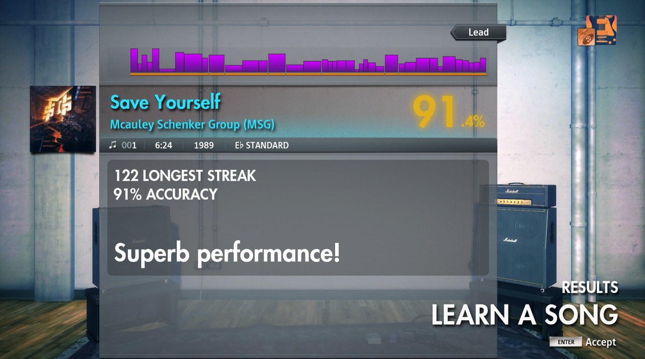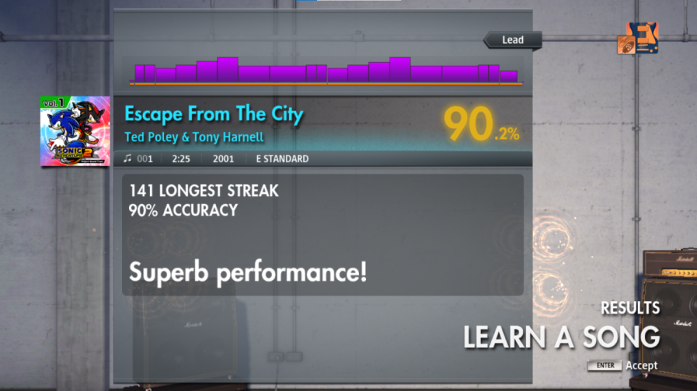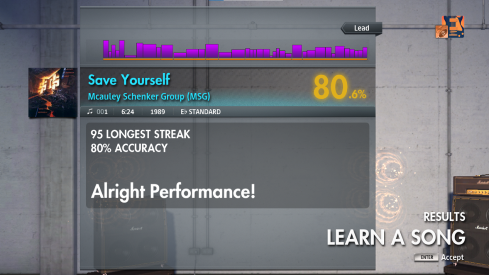 Usually, I always play in Learn a Song, but I get the impression that the percentage decimals are only taken into account in Score Attack mode. At the same time, I can see that I was given 98.40% for “Escape From The City” on lead, even though I played it in Learn a Song mode.